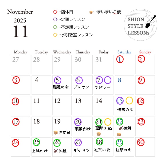 - イベントやレッスンの場合は、ご来店予約・ご参加予約をお願いします。(ギャラリー・店内へのご来場はご予約は不要です。お気軽にお越しください。)