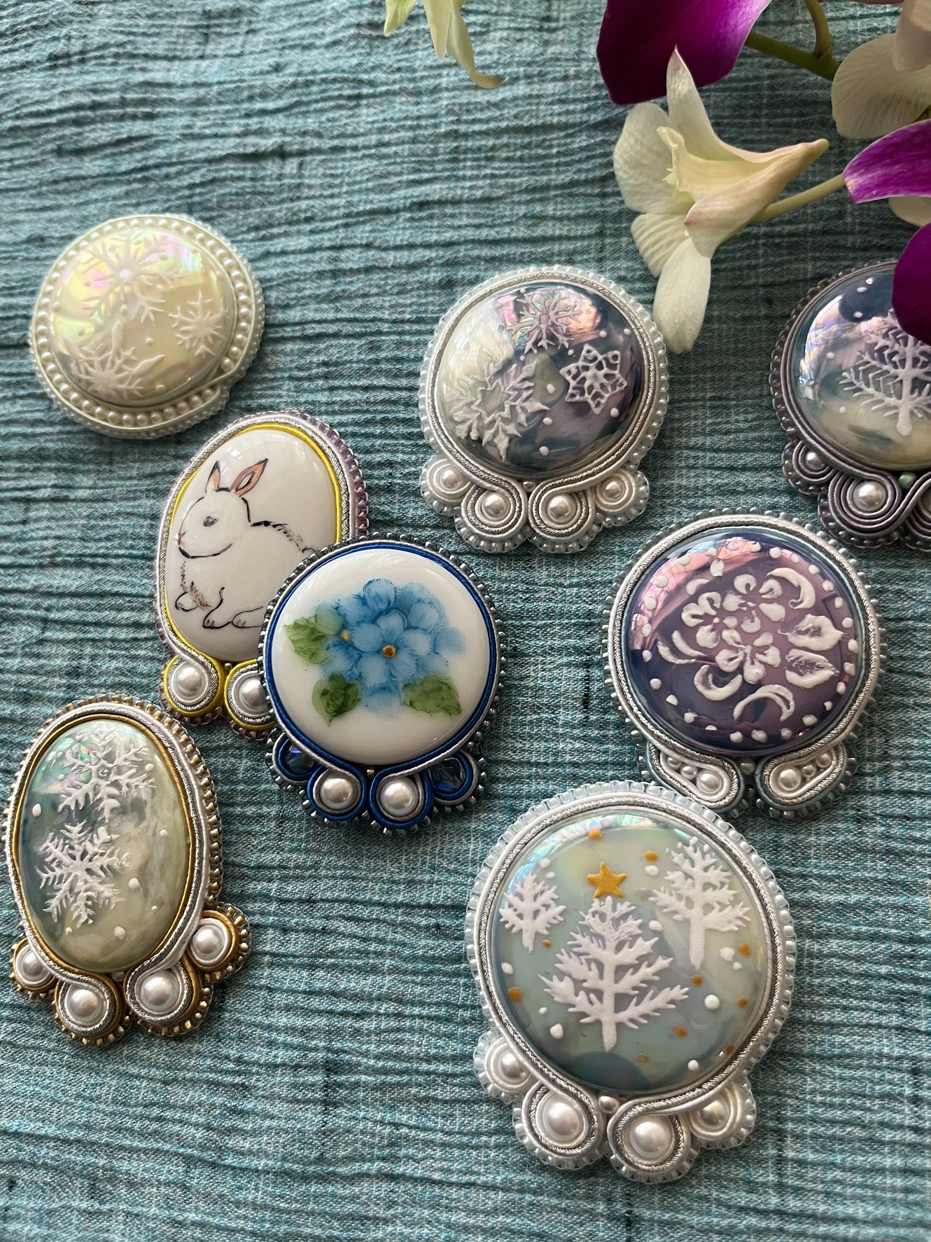※写真のブローチ周りのリボン飾り(ソウタシエ)は体験会には含まれていません。ブローチピンのみついてます。