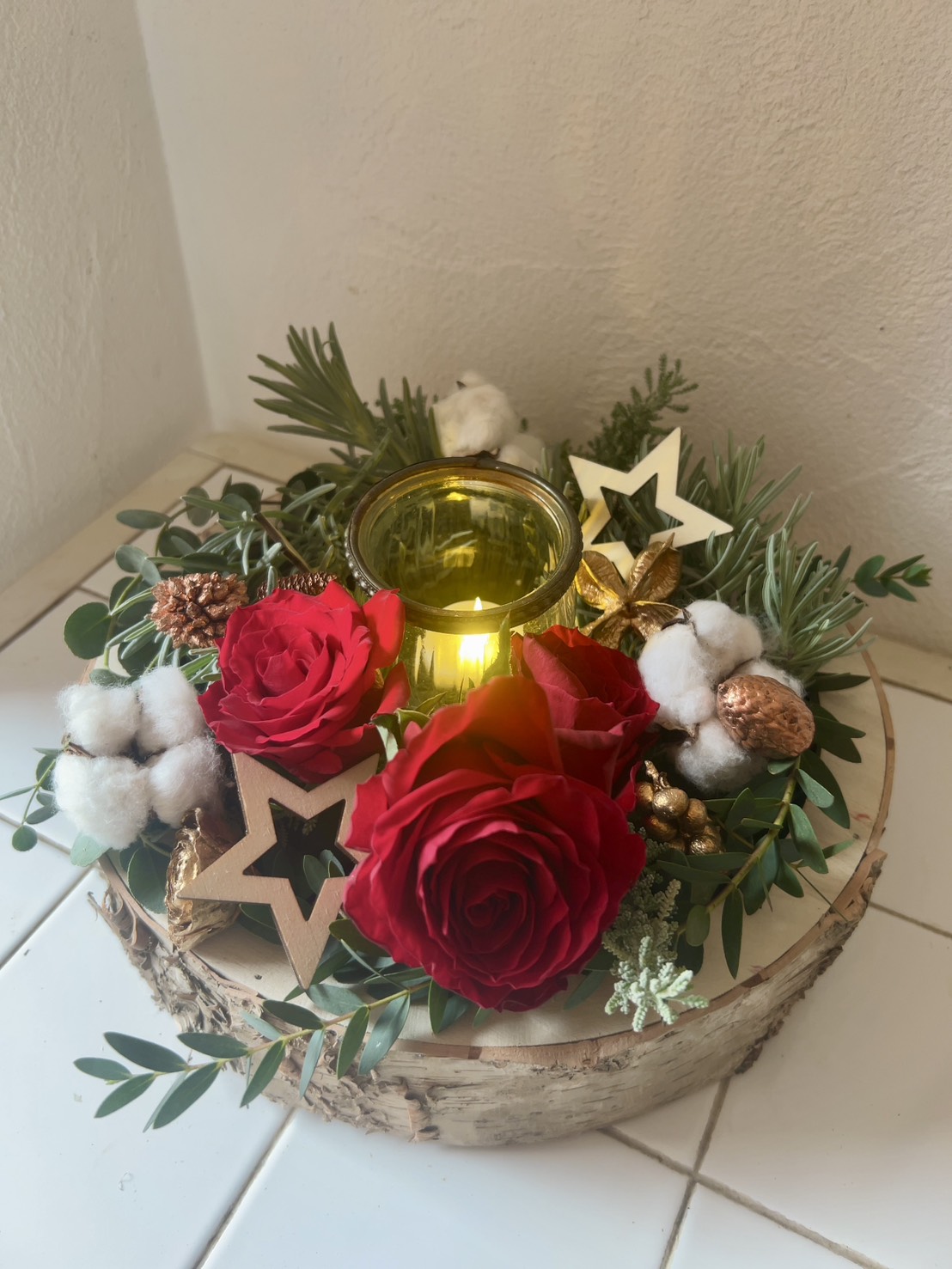 ウッドベースにクリスマスカラーのフラワーやグリーン、オーナメントをアレンジした華やかなクリスマスインテリアを作ります♪中央には電池式キャンドルも✨